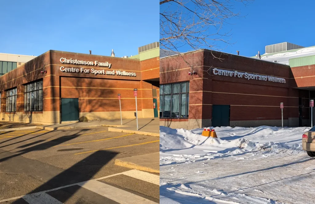 (Left) Centre for Sport and Wellness sign with the Christenson Family name on Nov. 12, 2025. Thai Sirikoone/the Griff. (Right) Centre for Sport and Wellness sign without the Christenson Family name on Jan. 6. Thai Sirikoone/the Griff. Christenson did not fulfill...