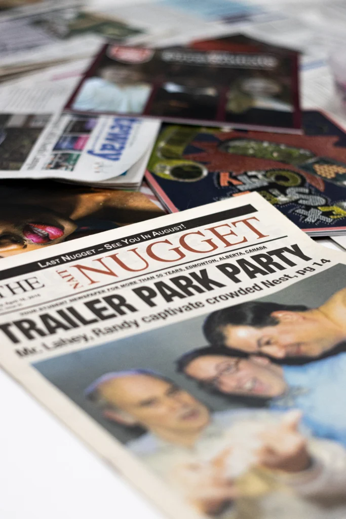 Over the last decade, Edmonton has witnessed the decline of small publications. The Yards, once a staple voice in the central Edmonton community, which serviced more than 24,000 mailboxes in the Wîhkwêntôwin and downtown areas, ceased publication as of 2021. The magazine carved out space for hyperlocal storytelling and neighbourhood identity, focusing on current events and urban planning in Edmonton’s downtown. VUE Weekly, which began publishing in 1995 as a weekly alternative newspaper, aimed to cover stories that were overlooked or misrepresented. It ceased publication in November 2018. VUE president Robert Doull explained in an interview with Global News that “the support for an alternative weekly in the Edmonton market has been declining for several years.” Rather than watch the paper struggle under “diminishing resources,” VUE shut down entirely in a loss that symbolized the shrinking ecosystem for independent local print media.